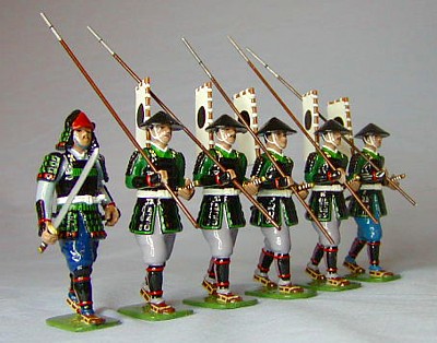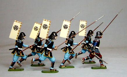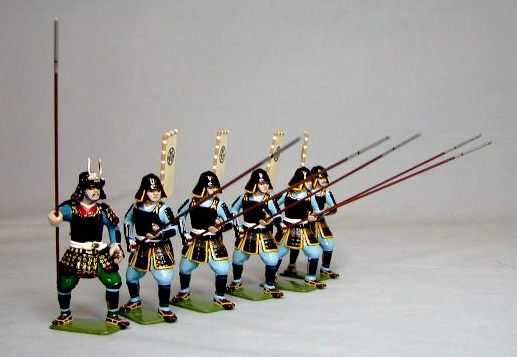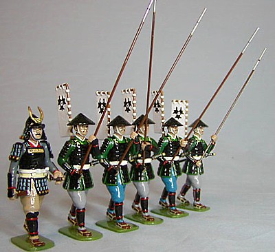 Sets are six pieces and usually contain one samurai and five ashigaru, the basic foot