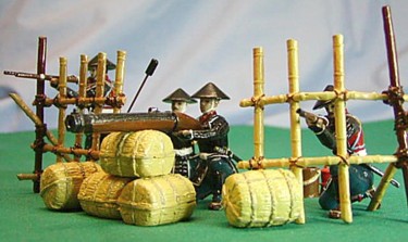 gunner, his helper, kneeling firing and standing firing arquebusiers, 2 bamboo fence